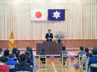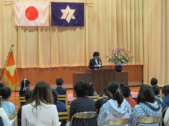 続いて第1学期始業式を行いました。校長が、今年度のスローガン「チーム楡小、スマイルリレー!」の意味を説明し、その後、職員紹介を行いました。担任が発表されるたびに拍手が起こり、どの子の顔も笑顔できらきら輝いていました。