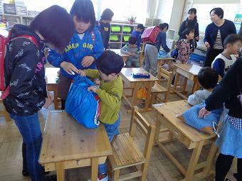 教室に入ると、6年生が、いろいろなお世話をしていました。1年生はどの子も笑顔がキラキラしていました。