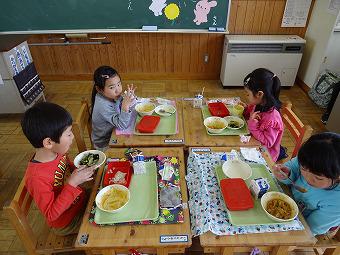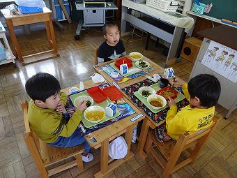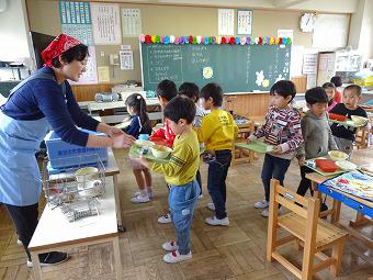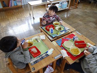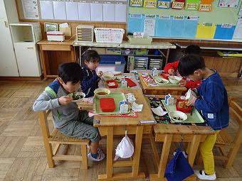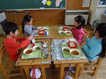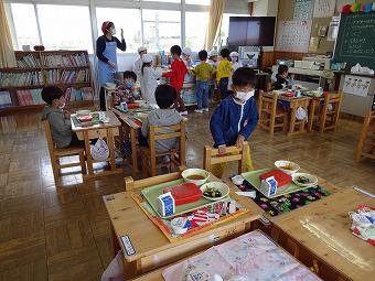 1年生が初めての給食を食べました。これまで牛乳が苦手だった子も、一生懸命に挑戦して、みごと完飲するなど、どの子も初めての給食を楽しんでいました。