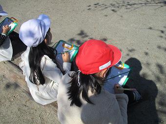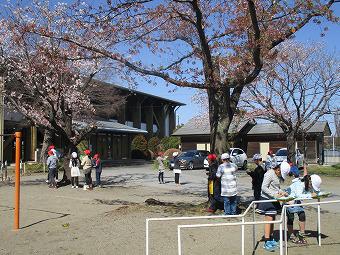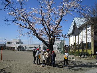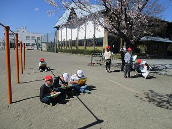 4年生が理科で、「生きものの様子を調べよう」の学習を行いました。校庭の草木を1年間観察する学習です。4年生は桜の木の1年間を調べることにして、第一回目の観察をしました。これから桜の木がどんなふうに変わっていくのか、どの子も興味津々で観察していました。