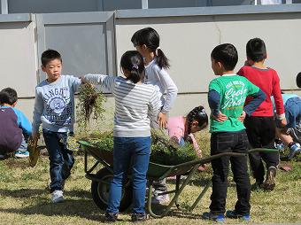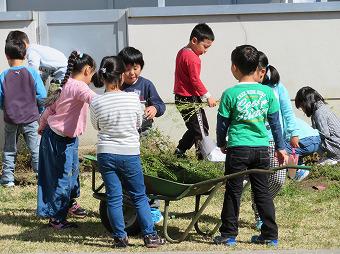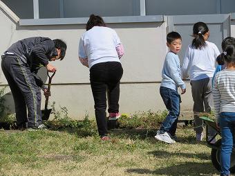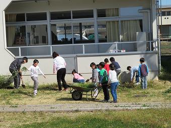2年生が生活科の時間に、これから自分たちで野菜を栽培する花壇の整備をしました。土を掘り起こしたり、草むしりをしたり。どの子も一生懸命取り組んでいました。