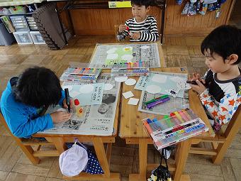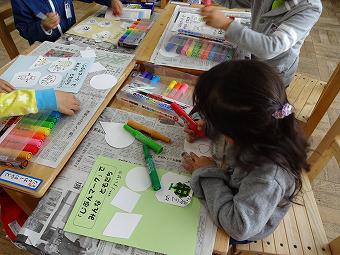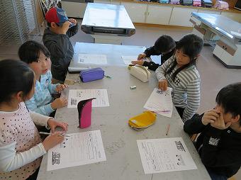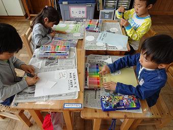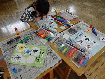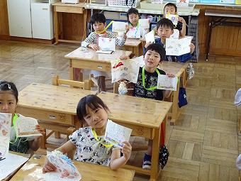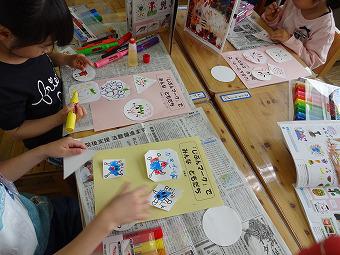 1年生が図工の時間に「自分マークをつくろう」の学習をしました。果物や野菜などの絵に工夫を加えて自分なりのマークをつくる学習です。できあがったマークは、みんなで友達になるために、それぞれ交換します。