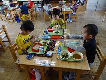 1年生が初めての給食を食べました。これまで牛乳が苦手だった子も、一生懸命に挑戦して、みごと完飲するなど、どの子も初めての給食を楽しんでいました。