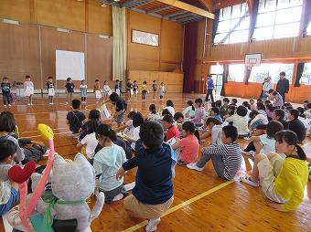 児童会主催で1年生を迎える会を行いました。4年生みんなでの歓迎の言葉のあと、5、6年生が考えたじゃんけんゲームやジェスチャーゲーム、2、3年生からのプレゼントなどで、1年生との楽しい交流の時間を過ごしました。