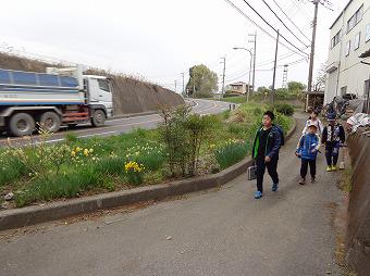 藤江地区からは今年度3名の1年生が入学しました。どの子も重いランドセルを背負って、長い道のりを、一生懸命歩いて登校しています。上学年の子は、1年生のペースに合わせたり、励ましたり、手をつないであげたり、優しく1年生をサポートしています。地域の方、保護者の方も温かく見守ってくださっています。