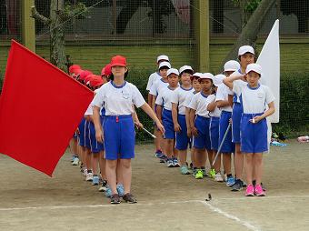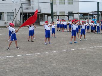 業間に運動会全体練習を行いました。入場から開会式の流れの練習です。高学年を中心に、どの子も一生懸命、自分の役割を果たしていました。