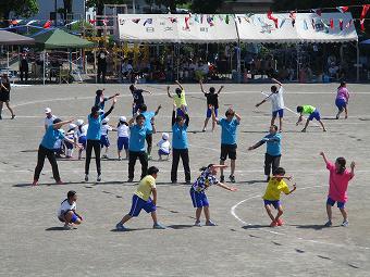 運動会全体練習は、昨日なかよし班ごとに練習した全校表現を、全体で合わせました。どのなかよし班も、上学年の子が下学年の子を面倒見ながら、一生懸命踊っていました。