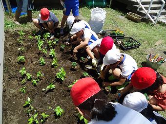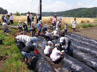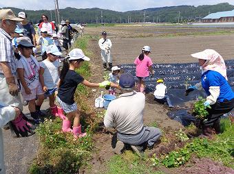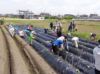 家庭の日推進事業の一環として南押原地区青少年市民育成会議が主催している「子ども農園」の1回目が行われました。南押原コミュニティセンター東の畑に親子でサツマイモを植え、育て、収穫することで、みんなで仲良く自然と触れあって、植物を育てる喜びと家族の触れあいを味わう企画です。秋には収穫祭・芋煮会も行われます。爽やかな陽光の下、本校児童、保護者も多く参加してサツマイモの苗植えが行われました。どの子も保護者も笑顔で自然と触れあっていました。帰りには、用水路にモグラが泳いでいるところに遭遇する嬉しいハプニングもありました。