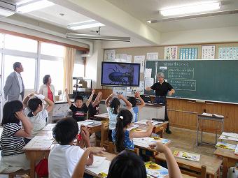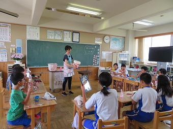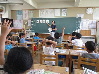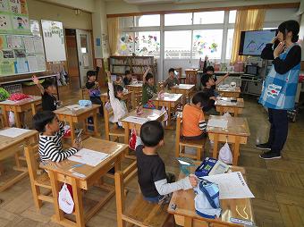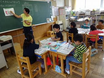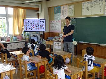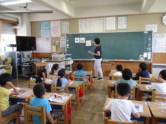 1年生が外国語活動を行いました。ALTの先生と一緒にあいさつやアルファベットの言い方などを覚えたり、友達同士で言い合ったりました。その後、ALT先生と一緒に給食を食べて、交流を深めました。