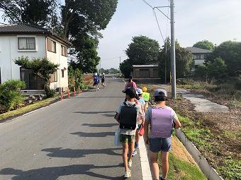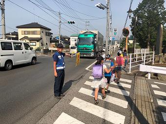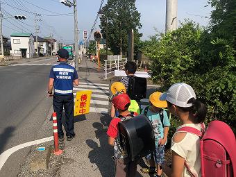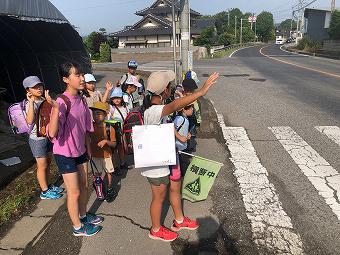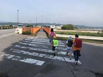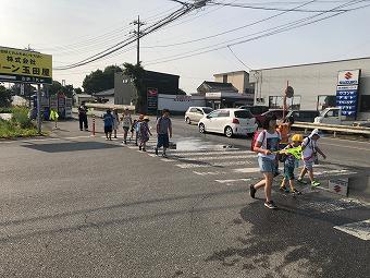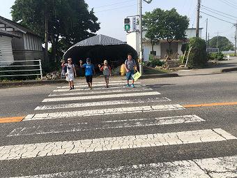 藤江方面の登校風景です。1年生から6年生まで、毎日、一生懸命歩いて登校しています。長い道のりなので、高速道路下で、一度給水します。横断歩道では班長さんの合図でしっかりと左右確認をします。登校路の途中では、保護者の方や交通指導員さんが見守ってくださっています。