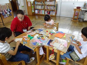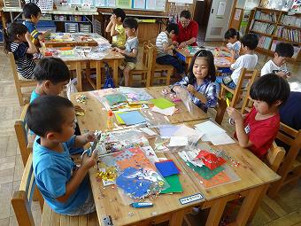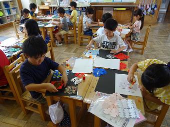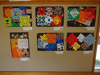 1年生が図工で「ちょっきんぱでかざろう」の学習を行いました。色紙を折って、はさみで切り込みをいれ、開くと模様ができます。そのように作った色紙を台紙に貼っていく学習です。はさみに慣れていない児童もいましたが、使っているうちにうまく切れるようになりました。どの子も一生懸命、学習に取り組んでいました。