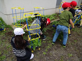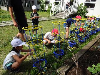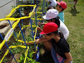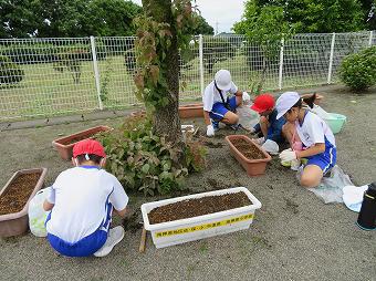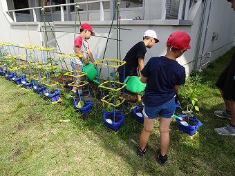 1年生がアサガオに支柱を立てたり、追肥をしたりましました。どの子もきれいなアサガオが咲くよう、一生懸命、育てています。