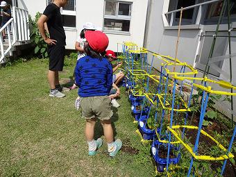 1年生が丹精込めて育てている朝顔のつるが出てきました。夏に向かって、いよいよ本格的に育ち始めています。