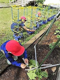 2年生が生活の時間に野菜の観察を行いました。伸びたつるの長さを、算数の長さの学習を生かしながら、ものさしを使って測っていました。