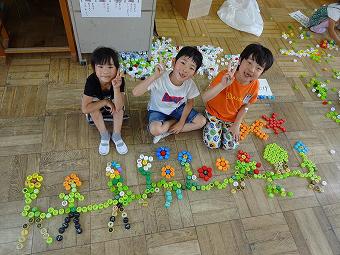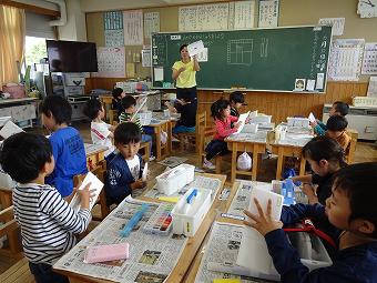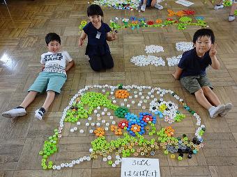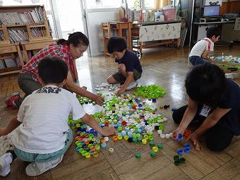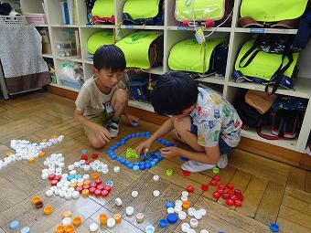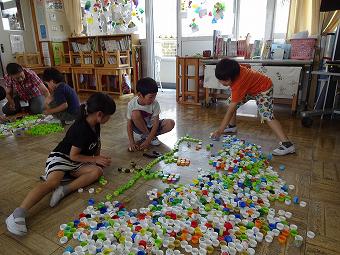 1年生が図工の時間に「いろいろ並べてみよう」の学習をしました。ペットボトルキャップを並べて想像の翼を広げる学習です。どの班も協力しながら、楽しく形を作っていました。