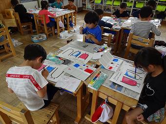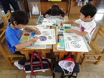1年生が初めて絵の具を使って絵を描きました。絵の具の使い方やパレットの使い方などを学んだ後、どの子も集中して色鮮やかに絵の具で色を塗る練習をしていました。