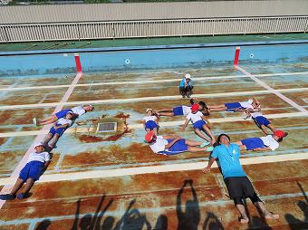 4~6年生がプール清掃を行いました。どの子も、真剣に前向きにプールをきれいに磨き上げていました。いよいよ水泳の季節がやってきました。最後にみんなで記念写真を撮り、その後、6年生が「仲間」の「仲」という人文字を作りました。