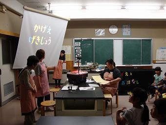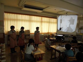 KLVの皆さんが3年生に影絵を見せてくださいました。題名は「お月さんを食べた話」です。どの子も瞬く間に物語の世界に引き込まれていきました。影絵が終わると、質問や感想を元気よく発表していました。