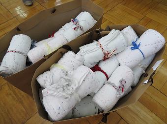 近隣のディケアサービス施設の方から申し出ありが、利用者の方が作ったぞうきんをいただけることとなりました。昼休みに施設の職員、利用者の方が来校し、代表の6年生にぞうきんを渡してくださいました。施設利用者のみなさんが真心こめて作ってくださったぞうきんです。感謝の思いを込めて、大切に使いたいと思います。ありがとうございました。