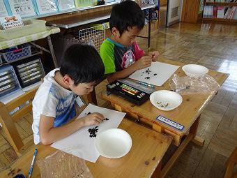 1年生が生活の時間にアサガオの種を採りました。前回に続いて二回目です。今日もたくさんの種を採取して数えました。来年の1年生へのプレゼントの準備が着々と進んでいます。