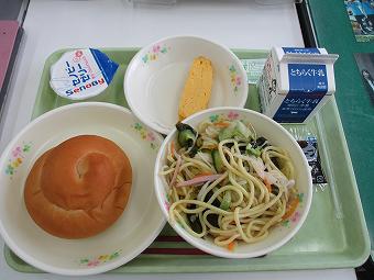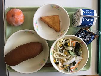 今日の給食は、牛乳、サラダうどん(めんつゆ)、チーズはんぺんフライ、ミニ黒パン、冷凍ミカンでした。