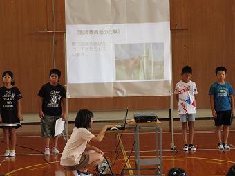 業間の時間に生活委員会の児童が集会を行いました。自分たちの仕事を発表した後、よい廊下の歩き方やあいさつの仕方を演じたり、クイズをだしてくれたりしました。とてもわかりやすい発表でした。その後、みんなで「小さな世界」を合唱しました。