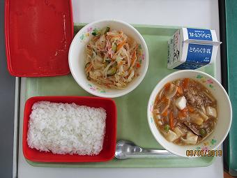 今日の給食は、ごはん、四川豆腐、中華和え、牛乳でした。