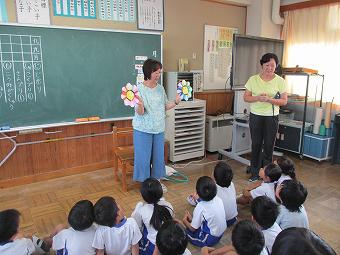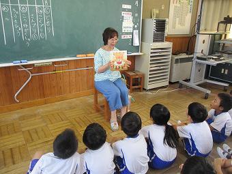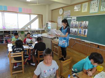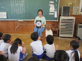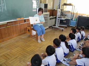 KLVの方が低学年に読み聞かせをしてくださいました。最初は「しあわせ」という絵本です。お母さんが洗濯してくれるしあわせ、ふとんのなかで一緒に眠るしあわせ。本校「ハッピーチャイム」にも関わるお話を選んで読んでくださいました。続いて「お月さまってどんなあじ?」を読んでくださいました。どちらの絵本も、子供たちは目を輝かせてお話の世界に入り込んでいました。最後にお月様の紙細工までいただきました。ありがとうございました。