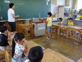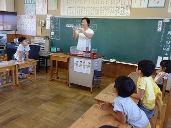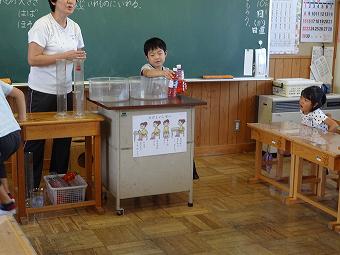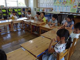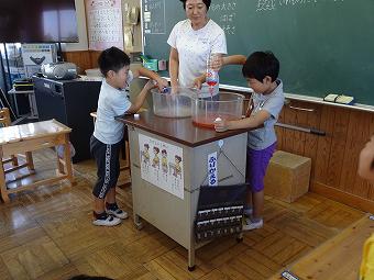 1年生が算数の時間に「どちらが多い?」の学習を行いました。いろいろな形の入れ物に入っている水の量を比べる学習です。いろいろな考えを発表する子供たち。最終的に「同じ入れ物で比べると、わかる」ことに、みんなが気付きました。