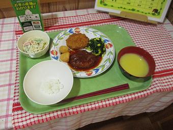 今日の給食は、ごはん、ハンバーグおろしソース、和風和え、味噌汁、牛乳でした。