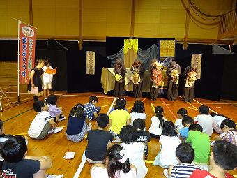人形劇まざあぐうすの皆さんが来校し、1~3年生にスライド絵本や人形劇を見せてくださいました。最初にスライド絵本『夢は牛のお医者さん』を、続いて、人形劇『カエルのお嫁さん』を演じてくださいました。子供たちは、どの子も、瞬く間に物語の世界に引き込まれて、最後まで楽しそうに観劇していました。まざあぐうすの皆さん、大変ありがとございました。