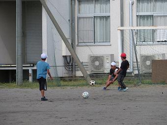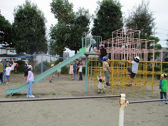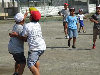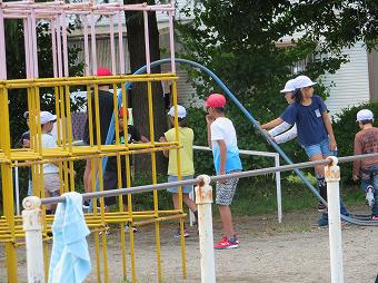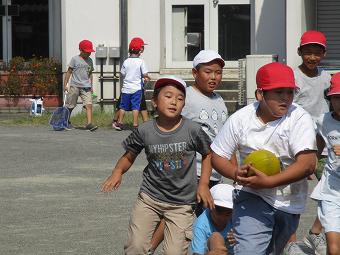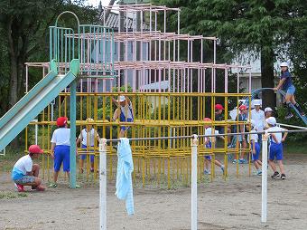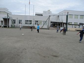昼休み。みんな、思い思いの遊びをしています。サッカー、ラグビー、ジャングルジム、ブランコ。サッカーでは、学生時代サッカー部だった先生と一緒にボールを追っています。ラグビーボールでタックルやスクラムをしています。「ノックオン」などの専門用語も聞かれます。ジャングルジム付近では学年関係なく、みんなで楽しそうに遊んでいます。1年生の男の子が蝉の幼虫を見つけ、6年生の女の子がのぞき込んでいます。先生と一緒に楽しそうに遊んでいる子達がいます。チャイムが鳴るとみんな一斉に昇降口に向かって駆け出しました。