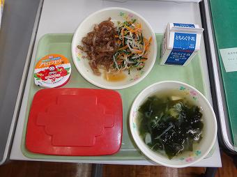 10月3日(木)の給食は、ごはん、わかめスープ、牛乳、ビビンバの具、アセロラゼリーでした。