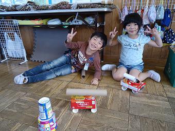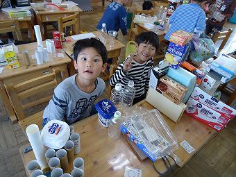 一年生が算数の時間に「形遊び」の学習をしました。生活に溢れるさまざまな容器を使ってチームで創造物を作りながら、形にはいろいろなものがあり、それぞれ特長があることに気付いていく学習です。どの子も意欲的に学習に取り組んでいました。