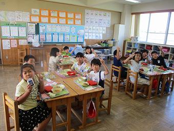 今日の給食は「鹿沼市お誕生日献立」でした。鹿沼市政71周年を記念した献立です。ごはん、鹿沼牛の焼肉丼の具、かんぴょうとにらの卵汁、カヌマンゼリーという,鹿沼にゆかりのある食材が使われた献立でした。1年生も2年生も楽しそうに会食していました。