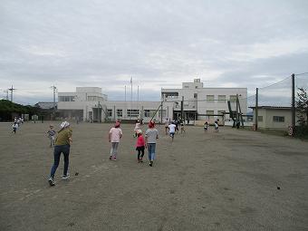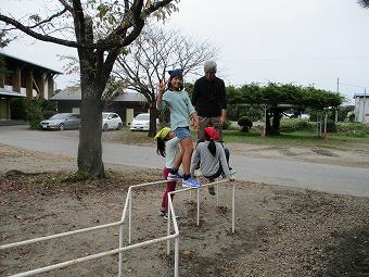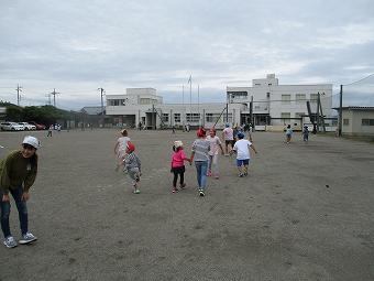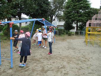 昼休み。みんな、思い思いの遊びをしています。サッカー、ラグビー、ジャングルジム、ブランコ。サッカーでは、学生時代サッカー部だった先生と一緒にボールを追っています。ラグビーボールでタックルやスクラムをしています。「ノックオン」などの専門用語も聞かれます。ジャングルジム付近では学年関係なく、みんなで楽しそうに遊んでいます。1年生の男の子が蝉の幼虫を見つけ、6年生の女の子がのぞき込んでいます。先生と一緒に楽しそうに遊んでいる子達がいます。チャイムが鳴るとみんな一斉に昇降口に向かって駆け出しました。