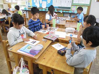 3年生が社会の時間に「スーパーマーケットの工夫」について学習しました。社会科見学でスーパーマーケットを見学した際のメモをもとに、気付いたことを付箋にまとめ、グループごとに模造紙に貼っていました。話合いながら、工夫がどのようになされているのかについて、真剣に考えていました。