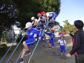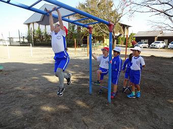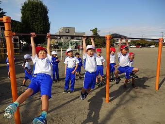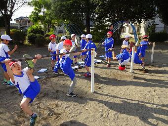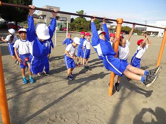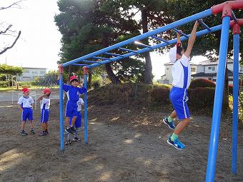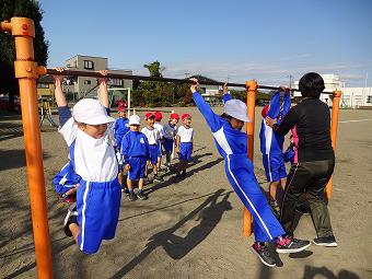 1年生が体育で鉄棒を行いました。最初に集会体力作りを行って、その後、鉄棒に取り組みました。どの子も自分のめあてに従って、一生懸命取り組んでいました。