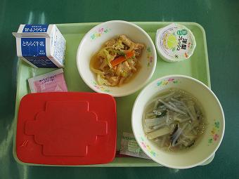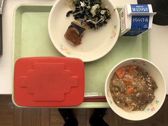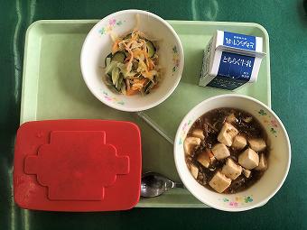今日の給食は、ご飯、牛乳、麻婆豆腐、中華和え、でした。