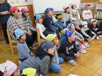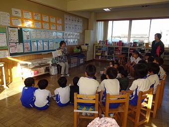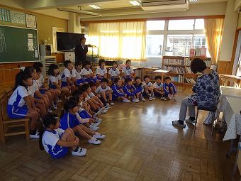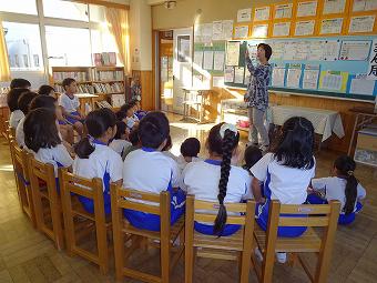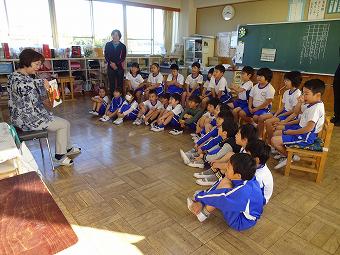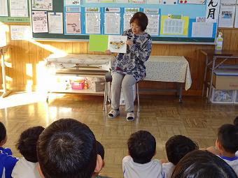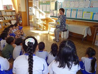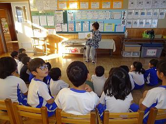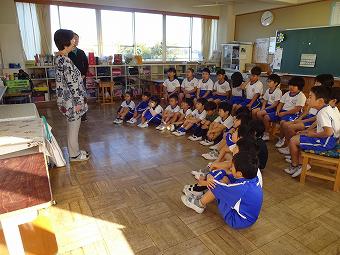 KLVの方が朝の学習の時間に1,2年生に読み聞かせをしてくださいました。食欲の秋にちなんで、「おいしいおと」、「バナナ事件」のふたつの絵本を読んでくださいました。どちらも食欲をそそるお話で、子供たちは「なんか、おなかがすいた」など、楽しく話に熱中していました。