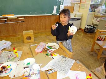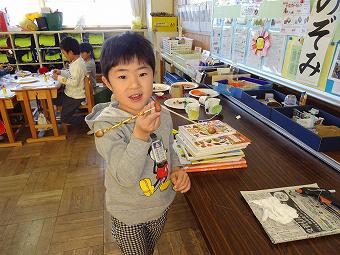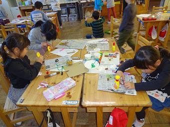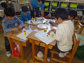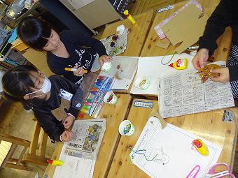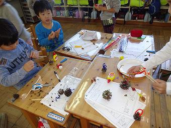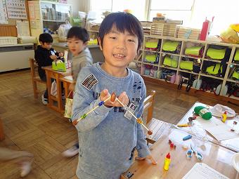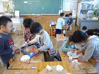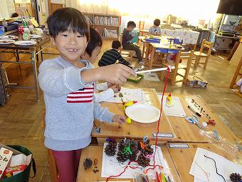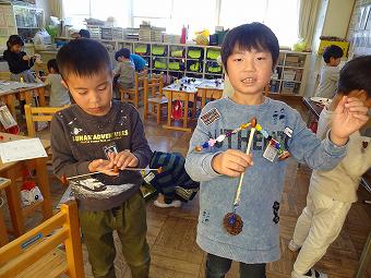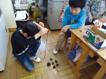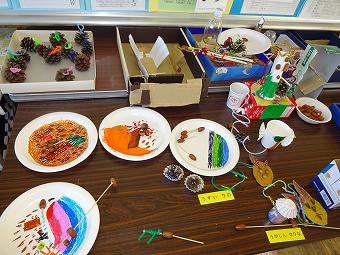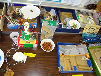 1年生が生活科で秋のおもちゃづくりを行いました。秋の自然物を使って、想像の翼を広げて、楽しいおもちゃを作りました。どの子も、意欲的に学習していました。