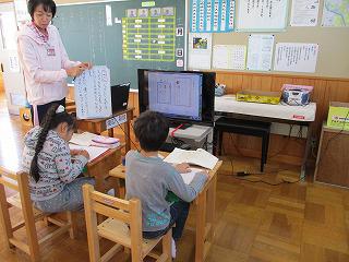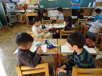 1年生が算数で、計算カードの学習をしました。2人組になり、繰り下がりのある引き算をやりとりしました。皆、意欲的に学習していました。
