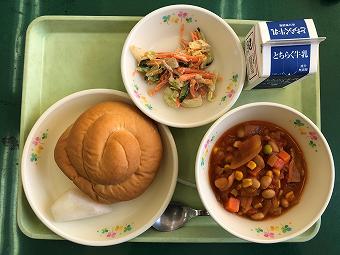 今日の給食は、バターロール、牛乳、ポークビーンズ、チキンごぼうサラダ、なし、でした。