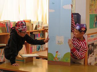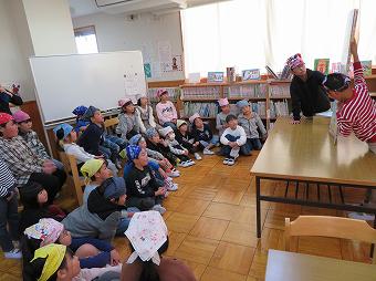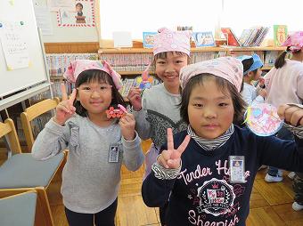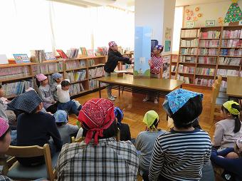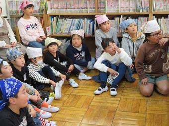 図書月間の一環として、今日から昼休みの図書委員読み聞かせが始まりました。初日の今日は、大型絵本を使って、上級生が下級生に楽しいお話を聞かせてくれました。聞き終わった子は、図書委員お手製のしおりをもらって、とても満足そうでした。