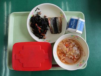 今日の給食は、ご飯、牛乳、さんまのひらき、五目煮、味噌汁でした。