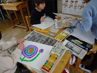 1年生が図工で「心に花を咲かせよう」の学習を行いました。卒業していく児童、来年度入学してくる児童に向けて、感謝の思いを込めながら、思い思いに花を描きました。どの子も、とても素敵な花を心に咲かせることができました。