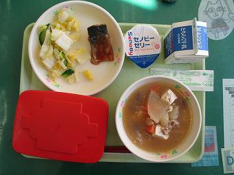 給食は、わかめご飯、鯖の味噌煮、豚汁、セノビーゼリー、牛乳でした。