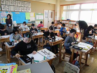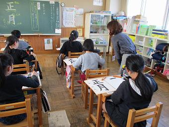 3年生が書写を行いました。地域ボランティアの方にもお手伝いいただき、「書き初め」を行いました。最初にみんなで、これまで学習してきたことを確認しました。止め、はね、払い、折れ・・・。それぞれ大切なことを確認してから、書き始めました。どの子も