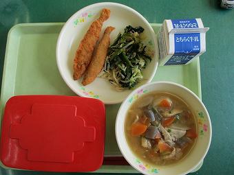 今日の給食は、ご飯、牛乳、ししゃもフライ、ソース、ごまあえ、田舎汁でした。