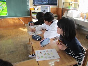 1年生が外国語活動を行いました。アルファベットを覚えたり、簡単な会話をしたり、楽しく英語を学びました。